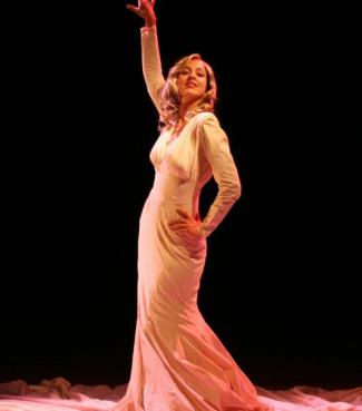 We enter the theatre and see a buxom blonde with red lipstick, dressed in a white gown that literally covers the whole stage. She is frozen in place, and perhaps in time too. With the trademark peek-a-boo golden locks covering one eye, Alex Ellis is the mirror-image of the dazzling and tragic celebrity that was Veronica Lake.