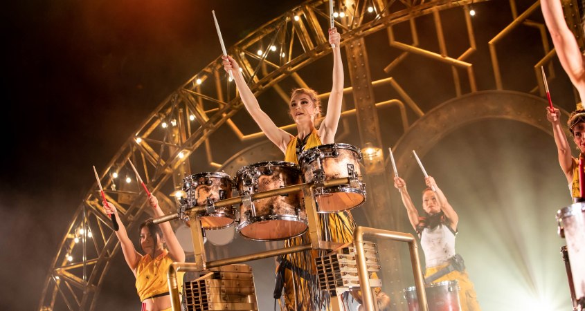 The set looked like some kind of under-the-city world with exposed pipes forming arcs across the stage. The queens came out in a series of variations on the yellow overall and white singlet combo, each reflecting the personality of their character. And as the show went on, there were more and more set reveals, including a series of moving platforms with varieties of percussion set-up that allowed the drumming to be transformed into fully choreographed numbers.