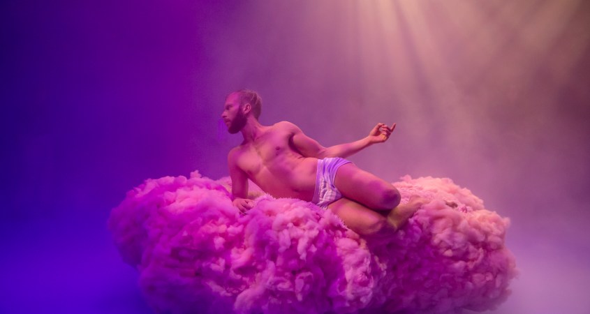 At the opening of Daddy last night, the audience entering the performance space were greeted with the sight of Wiradjuri artist Joel Bray, clad only into a pair fluorescent pink hot pants, reclining artfully on a fluffy cloud of fairy floss. This cheeky image slowly morphed through poses of contorted classical imagery alongside grotesque parodies of childish innocence, signalling the wide range of expression Bray would traverse in the next hour.